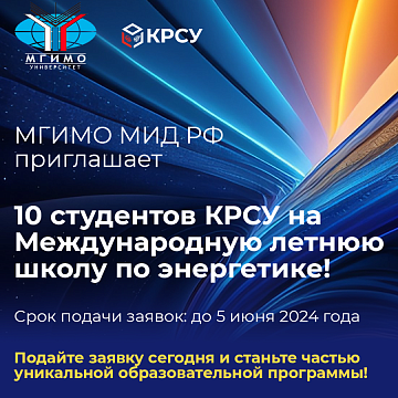 МГИМО МИД РФ приглашает 10 студентов КРСУ на Международную летнюю школу по энергетике! 31 мая 2024 Объявление